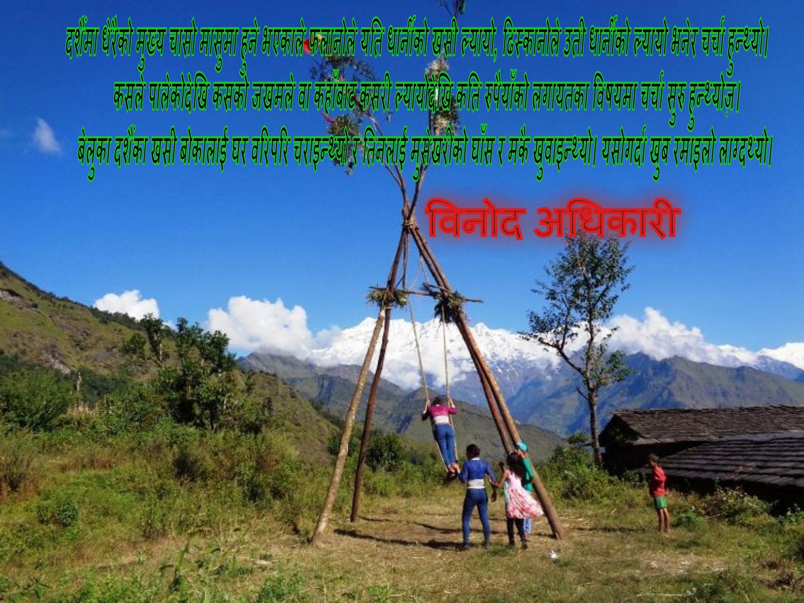घटस्थापनाको अघिल्लो दिन हाफ छुट्टीमै स्कुलले १५ दिने बिदाको जानकारी गराएपछि अब १५ दिनसम्म स्कूल आउन नपर्ने खुशीयालीसँगै झोला बोकेर घरतिर कुलेलम ठोकिन्थ्यो। खुसियाली प्रकट गर्न बोकिराखेको झोला आकाशतिर हुत्याउँदै समात्दै गरेर रमाइथ्यो– बाटोमा। यस्तैयस्तै अनेक सूचक थिए, जसले भन्थ्यो– अब दसैं सुरु भयो।