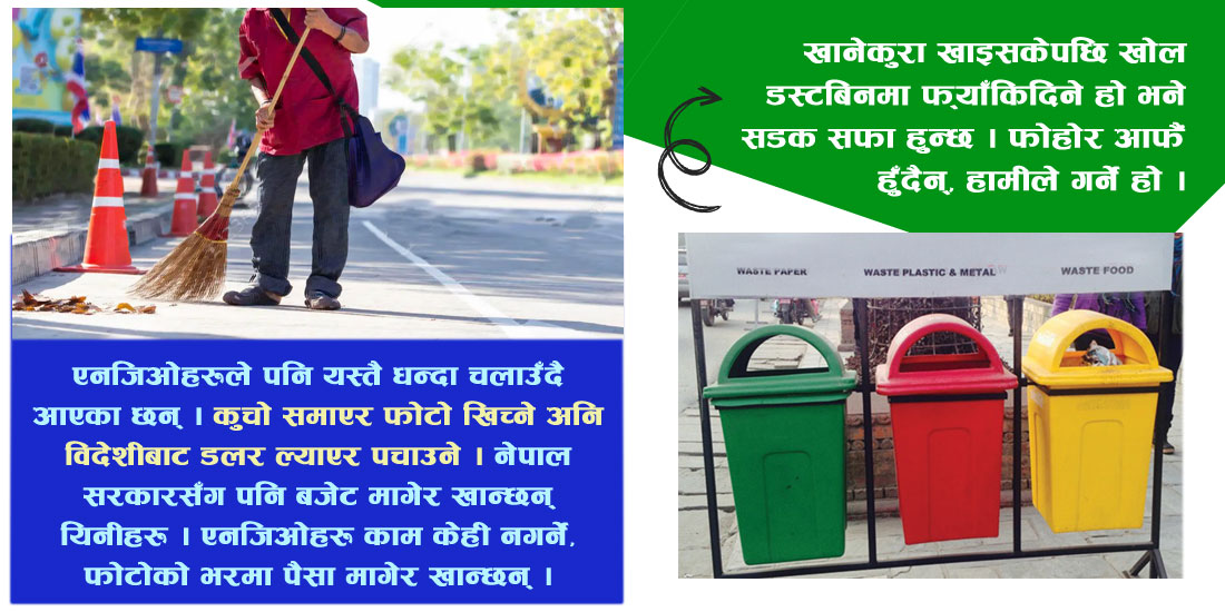 गैरसरकारी संस्थाहरूले पनि यस्तै धन्दा चलाउँदै आएका छन् । कुचो समाएर फोटो खिच्ने अनि विदेशीबाट डलर ल्याएर पचाउने । नेपाल सरकारसँग पनि बजेट मागेर खान्छन् यिनीहरू । एनजिओहरू काम केही नगर्ने, फोटोको भरमा पैसा मागेर खान्छन् ।