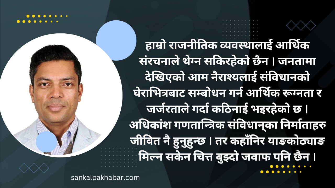 सातवटा संविधानका अन्तरवस्तु हेर्दा ती कुनैले पनि शासकीय स्वरूप वा राजनीतिक स्थापनामा बाहेक आर्थिक उपार्जनका बारेमा जोड दिएर खास उपलब्धि हासिल गर्न सकेको छैन् । हाम्रो राजनीतिक व्यवस्थालाई आर्थिक संरचनाले थेग्न सकिरहेको छैन । जनतामा देखिएको आम नैराश्यलाई संविधानको घेराभित्रबाट सम्बोधन गर्न आर्थिक रुग्नता र जर्जरताले गर्दा कठिनाई भइरहेको छ । अधिकांश गणतान्त्रिक संविधानका निर्माताहरू जीवित नै हुनुहुन्छ । तर कहाँनिर र्याङ्कोठ्याङ मिल्न सकेन चित्त बुझ्दो जवाफ पनि छैन् ।