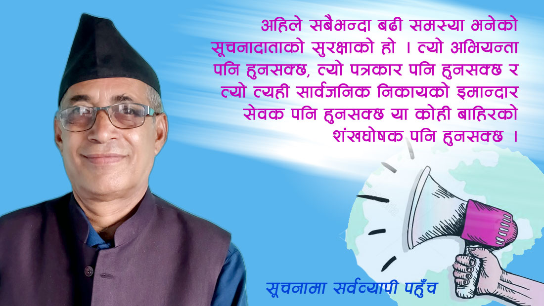 अहिले सबैभन्दा बढी समस्या भनेको सूचनादाताको सुरक्षाको हो । त्यो अभियन्ता पनि हुनसक्छ, त्यो पत्रकार पनि हुनसक्छ र त्यो त्यही सार्वजनिक निकायको इमान्दार सेवक पनि हुनसक्छ या कोही बाहिरको शंखघोषक पनि हुनसक्छ । अर्थात् सिट्ठी बजाउने इमान्दार सूचक । वा शंख बजाएर सूचना खुला गर्न सचेत गराउने वा भएका सूचनाहरुको लुकेको ठाउँको खुलासा गर्ने व्यक्ति । उसको सुरक्षा सबैभन्दा चुनौतीको विषय हो । यसको लागि सर्वप्रथम आयोग आफैँ विश्वसनीय संस्थाको रुपमा विकसित हुनुपर्छ, दोस्रोमा आयोग सशक्त हुनुपर्छ र स्वतन्त्ररुपमा, निर्भीक भएर अनि निष्पक्षरुपमा निर्णय गर्ने , निर्णयको कार्यान्वयनका लागि सशक्त भूमिका निर्बाह गर्ने र अनुगमनको सुदृढ अनि सशक्त व्यवस्था गरिनुपर्छ ।