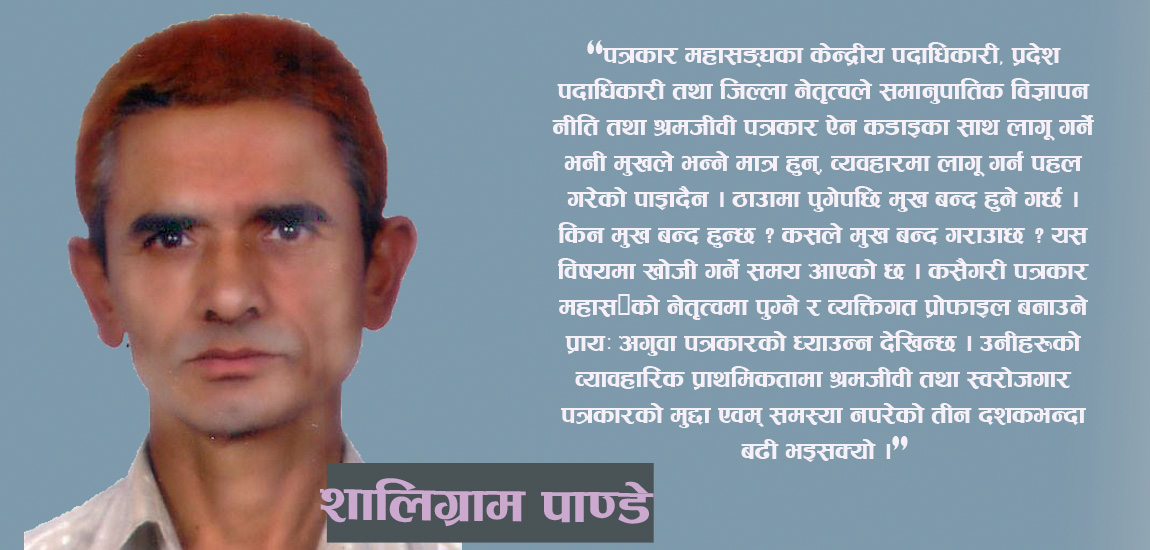 पत्रकार महासङ्घका केन्द्रीय पदाधिकारी, प्रदेश पदाधिकारी तथा जिल्ला नेतृत्वले समानुपातिक विज्ञापन नीति तथा श्रमजीवी पत्रकार ऐन कडाइका साथ लागू गर्ने भनी मुखले भन्ने मात्र हुन्, व्यवहारमा लागू गर्न पहल गरेको पाइँदैन । ठाउँमा पुगेपछि मुख बन्द हुने गर्छ । किन मुख बन्द हुन्छ ? कसले मुख बन्द गराउँछ ? यस विषयमा खोजी गर्ने समय आएको छ । कसैगरी पत्रकार महासङ्घको नेतृत्वमा पुग्ने र व्यक्तिगत प्रोफाइल बनाउने प्रायः अगुवा पत्रकारको ध्याउन्न देखिन्छ । उनीहरूको व्यावहारिक प्राथमिकतामा श्रमजीवी तथा स्वरोजगार पत्रकारको मुद्दा एवम् समस्या नपरेको तीन दशकभन्दा बढी भइसक्यो ।