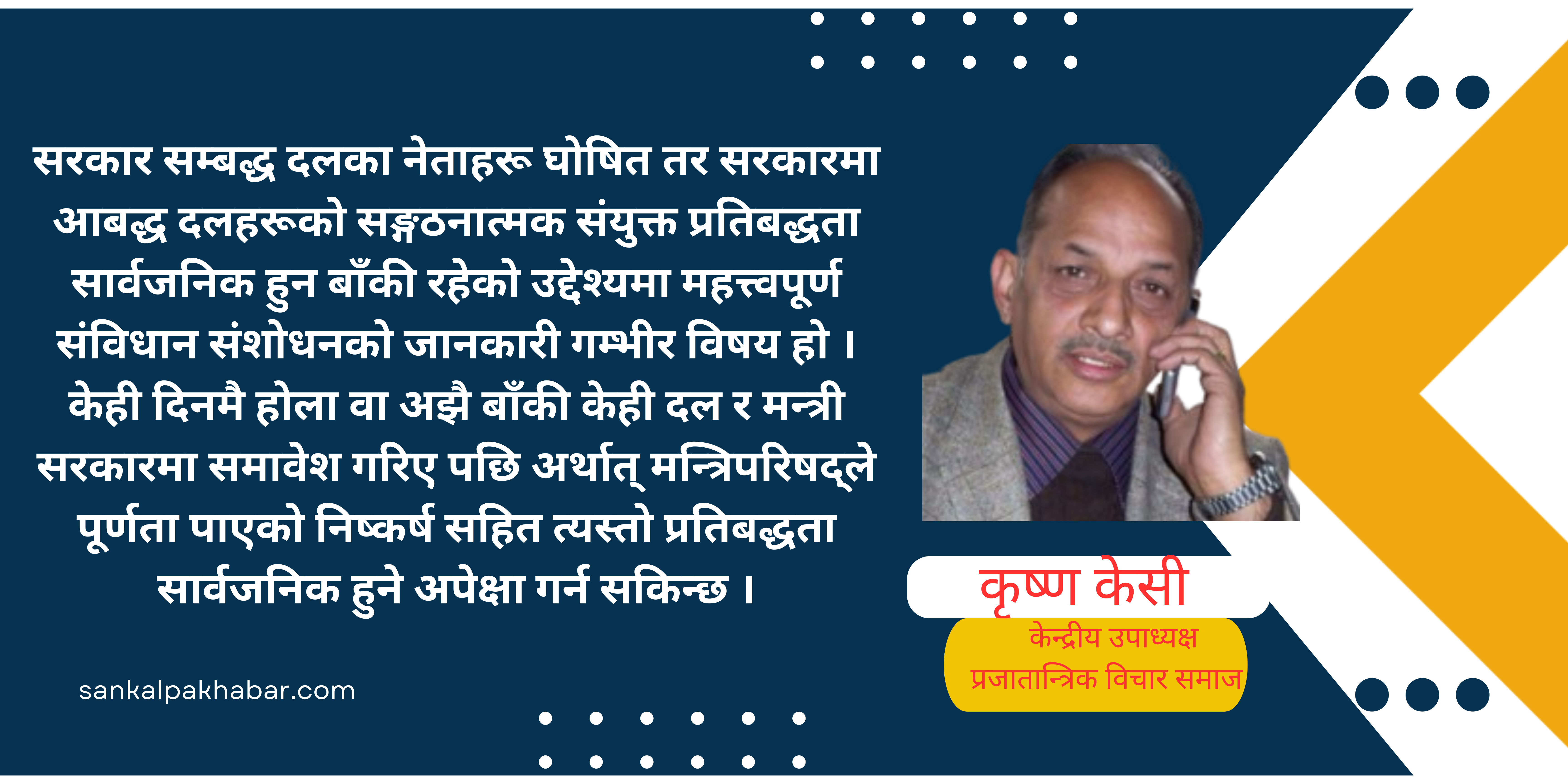 सरकार सम्बद्ध दलका नेताहरु घोषित तर सरकारमा आबद्ध दलहरुको संगठनात्मक संयुक्त प्रतिबद्धता सार्वजनिक हुन बाँकी रहेको उद्देश्यमा महत्वपूर्ण संविधान संशोधनको जानकारी गम्भीर विषय हो । केही दिनमै होला वा अझै बाँकी केही दल र मन्त्री सरकारमा समावेश गरिए पछि अर्थात् मन्त्रिपरिषद्ले पूर्णता पाएको निष्कर्ष सहित त्यस्तो प्रतिबद्धता सार्वजनिक हुने अपेक्षा गर्न सकिन्छ ।