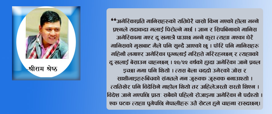 अमेरिकाप्रति मानिसहरूको यतिधेरै चासो किन भएको होला भन्ने प्रश्नले यदाकदा मलाई पिरोल्ने गर्छ । ज्ञान र सिपबिनाको मानिस अमेरिकामा गएर दुःखमात्रै पाउँछ भन्ने कुरा त्यहाँ गएका धेरै मानिसको मुखबाट मैले पनि सुन्दै आएको छु । फेरि पनि मानिसहरू महिनौ लगाएर अमेरिका पुग्नलाई मरिहत्ते गरिरहन्छन् र त्यहाँको दुःखलाई बेसाउन चाहन्छन् । २०/२२ वर्षको हुँदा अमेरिका जाने प्रवल इच्छा ममा पनि थियो । त्यस बेला चढ्दो उमेरको जोस र साथीभाइहरूबिचको सङ्गतले मन जुरुक्क जुरुक्क बनाउँथ्यो । त्यतिखेर पनि विदेसिने माहोल थियो तर अहिलेजस्तो सस्तो थिएन । विदेश जाने भएपछि प्रायः सबैको पहिलो रोजाइमा अमेरिका नै पर्दथ्यो । एक पटक त्यहाँ पुगेपछि नेपालीहरू उतै सेटल हुने चाहना राख्दछन् । मेरो पनि अमेरिकामा सेटल भएर ग्रिनकार्ड लिने उतिबेलाको ठुुलै सपना थियो तर त्यतिबेला पूरा भएन पछि त्यो विचारै मरेर गयो र मलाई यतै बस्नुपर्छ भन्ने भयो । अब त्यसप्रति कुनै गुनासो छैन ।