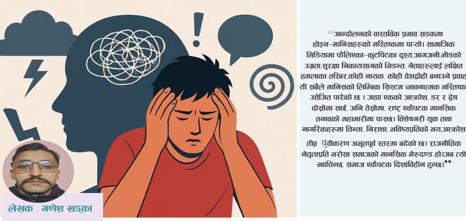 आन्दोलनको वास्तविक प्रभाव सडकमा होइन—मानिसहरूको मस्तिष्कमा पार्यो। सामाजिक मिडियामा फैलिएका—कुटपिटका दृश्य,आगजनी,भीडको उग्रता,सुरक्षा निकायसँगको भिडन्त, नेताहरूलाई लक्षित हमलाका तस्बिर,कोही नायक, कोही देशद्रोही बनाउने प्रवाह यी सबैले मानिसको लिम्बिक सिस्टम (भावनात्मक मस्तिष्क) उत्तेजित पारेको छ । जहाँ एकको आक्रोश, डर र द्वेष दोस्रोमा सर्छ, अनि तेस्रोमा, राष्ट्र एकैपटक मानसिक तनावको महामारीमा फस्छ। विशेषगरी युवा तथा नागरिकहरुमा चिन्ता, निराशा, भविष्यप्रतिको भय,आक्रोश तीव्र ध्रुवीकरण अभूतपूर्व स्तरमा बढेको छ। राजनीतिक नेतृत्वप्रति भरोसा समाजको मानसिक मेरुदण्ड हो।जब त्यो भाँचिन्छ, समाज एकैपटक दिशाविहीन हुन्छ। जेनजी आन्दोलनपछि— नेताको भाषणलाई विश्वास गर्ने मानिस घटे,सरकारलाई समाधान होइन, समस्या ठान्ने सोच बढ्यो ,राजनीतिक दलहरूप्रति आक्रोश तीव्र बन्यो ,नयाँ नेतृत्व खोज्ने मनोविज्ञान चरममा पुग्यो । यही अविश्वासले सामाजिक स्थिरता र मानसिक सुरक्षाबिचको दुरी लम्ब्याएको छ ।