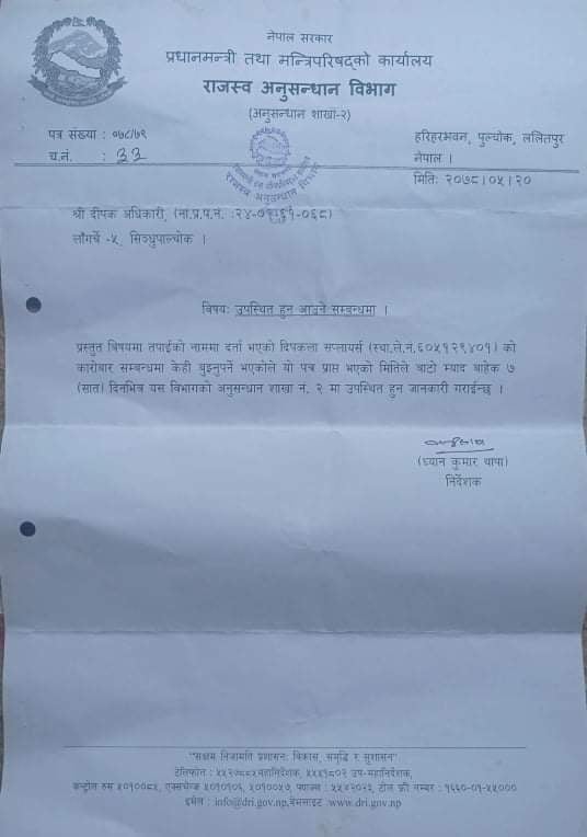 धितालसँगै लागर्चे गाउँँका दीपक अधिकारी र दीपक भुजेलको नाममा पनि राजस्व अनुसन्धान विभागले उस्तै व्यहोराको पत्र पठाएको छ । राजस्वले काटेको पत्रमा उनीहरुकोे नामक कम्पनी दर्ता भएर कारोबार भएको छ । तर यी युवाहरू गाउँमा सामान्य मजदुरी गरेर बसिरहेका छन्, कोही काठमाडौं जागिर गर्दै छन्, कोही रोजगारीको लागि विदेशमा छन् ।