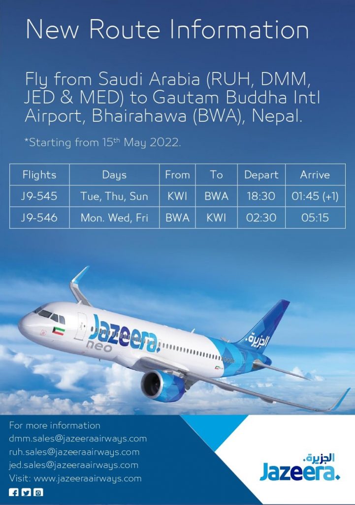 आगामी जुन महिनादेखि रियाद, दमाम, जेद्दा र मदिना सहरबाट नियमित उडान सञ्चालन गर्ने तालिका सार्वजनिक गरेको हो । जजिरा एयरवेजले सातामा तीन उडान गर्ने भएको छ । भैरहवादेखि कुवेत र कुवेतदेखि भैरहवा गरी साताको तीन उडान गर्नेगरी जजिरा एयरवेजले उडान तालिका सार्वजनिक गरेको हो ।