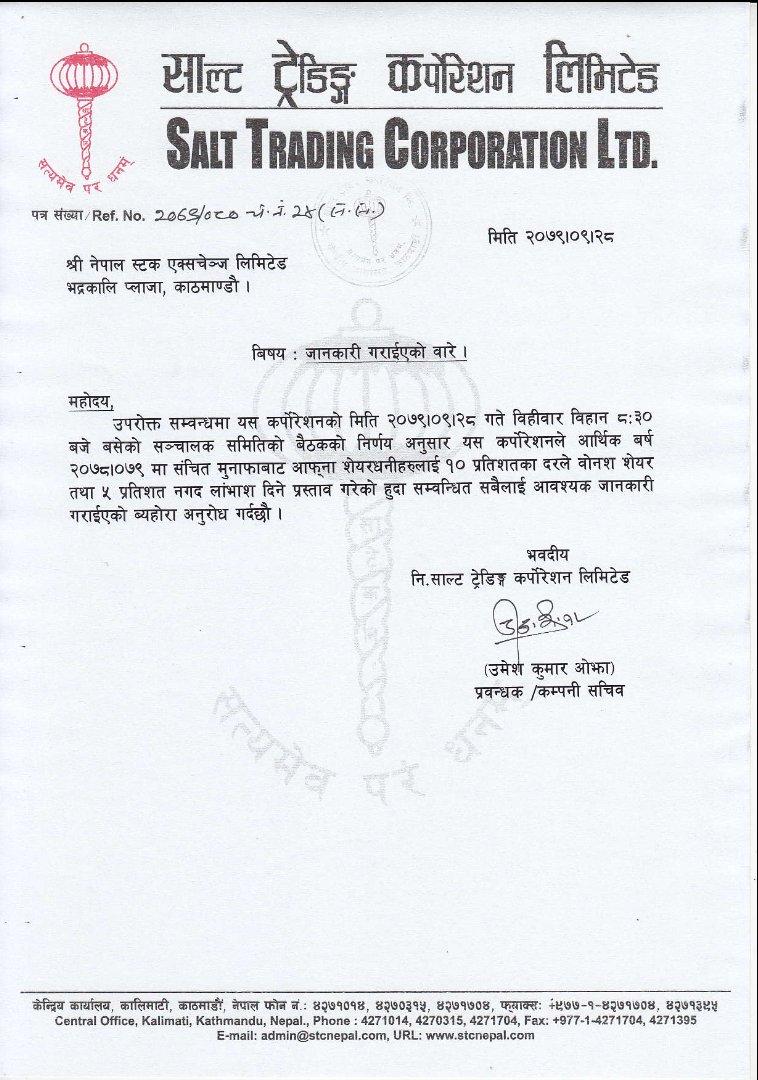 काठमाडौँ । साल्ट ट्रेडिङ कर्पोरेसनले लाभांश वितरण गर्ने घोषणा गरेको छ । कर्पोरेसनको बिहीबार बिहान बसेको सञ्चालक समितिको बैठकले आर्थिक वर्ष २०७८्र्र्र्र्र् \ ७९ को नाफाबाट कुल १५ प्रतिशत लाभांश वितरण गर्न लागेको हो ।