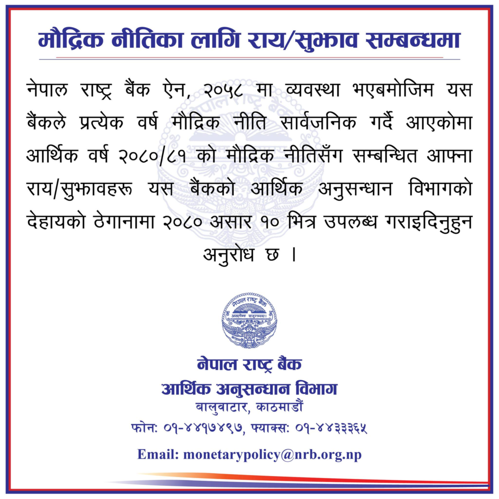 राष्ट्र बैंकले जारी गरेको सूचनामा भनेको छ, ‘नेपाल राष्ट्र बैंक ऐन २०५८ मा व्यवस्था भए बमोजिम यस बैंकले प्रत्येक वर्ष मौद्रिक नीति सार्वजनिक गर्दै आएकोमा आगामी आर्थिक वर्षको मौद्रिक नीतिको बारेमा आफ्नो सुझाव राष्ट्र बैंकमा असार १० भित्र उपलब्ध गराउन अनुरोध छ।’