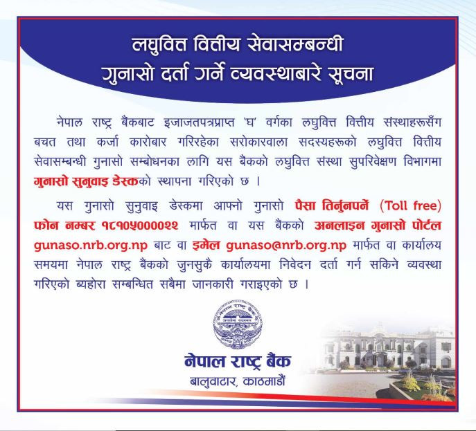 काठमाडौं । नेपाल राष्ट्र बैंकले लघुवित्त वित्तीय सेवासम्बन्धी गुनासो सम्बोधनका लागि गुनासो सुनुवाइ डेस्कको स्थापना गरेको छ ।