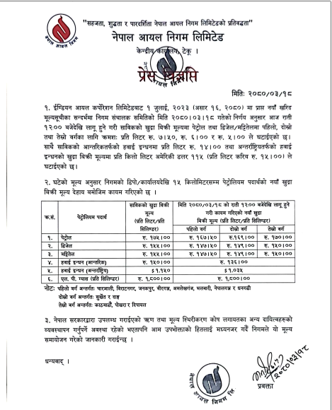 सोमवार साँझ बसेको निगम सञ्चालक समितिको बैठकले काठमाडौं‚ पोखरा र दीपायलमा पेट्रोल, डिजेल र मट्टितेलमा प्रतिलिटर ५–५ रुपैयाँ मूल्य र तराईको हकमा प्रतिलिटर ७ रुपैयाँ ५० पैसा घटाएको छ भने सुर्खेत र दाङमा प्रतिलिटर ६ रुपैयाँका दरले घटाउने निर्णय गरेको हो ।