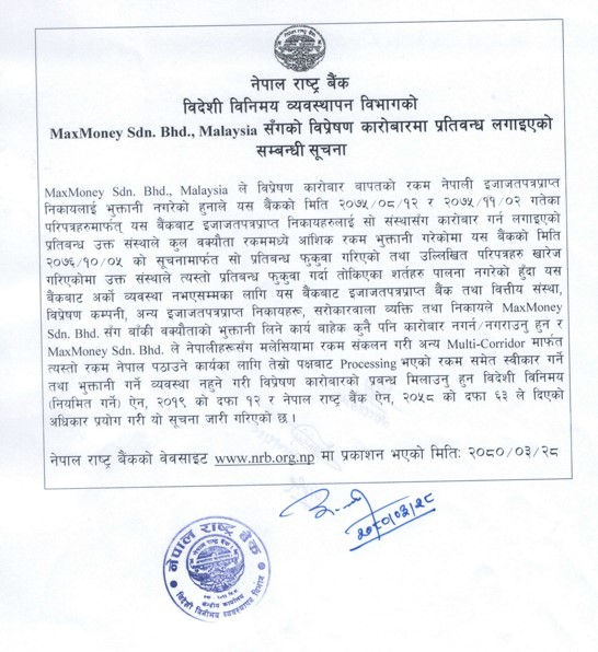 सोही कारण अर्को व्यवस्था नभएसम्मका लागि राष्ट्र बैंकबाट इजाजतपत्र प्राप्त बैंक तथा वित्तीय संस्था, विप्रेषण कम्पनी, अन्य इजाजतपत्र प्राप्त निकायहरू, सरोकारवाला व्यक्ति तथा निकायले म्याक्स मनीसँग बाँकी वक्यौताको भुक्तानी लिने बाहेक कुनै पनि कारोबार नगर्न निर्देशन दिएको सूचनामा उल्लेख छ।