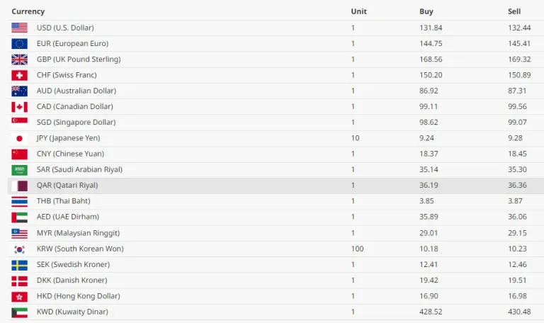 कतारी रियालको मूल्य एकको खरिद दर ३६ रुपैयाँ २६ पैसा र बिक्री दर ३६ रुपैयाँ ४२ पैसा रहेको राष्ट्र बैंकले जनाएको छ।