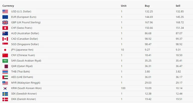 अमेरिकी डलर एकको खरिद दर १३२ रुपैयाँ २५ पैसा र बिक्री दर १३२ रुपैयाँ ८५ पैसा पुगेको छ। युरो एकको खरिद दर १४४ रुपैयाँ ६९ पैसा र बिक्री दर १४५ रुपैयाँ ३५ पैसा रहेको छ।