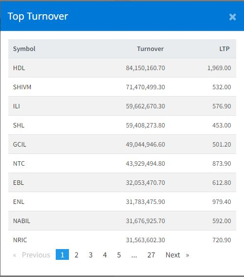 त्यस्तै, शिवम् सिमेन्ट्सको ७ करोड १ लाख ५७ हजार रुपैयाँ,आइएमई लाइफ इन्स्योरेन्सको ५ करोड ९५ लाख १२ हजार रुपैयाँ, सोल्टी होटलको ५ करोड ९२ लाख २७ हजार रुपैयाँ र घोराही सिमेन्ट इन्डस्ट्रीको ४ करोड ९० लाख ४ हजार रुपैयाँको कारोबार भएको हो ।