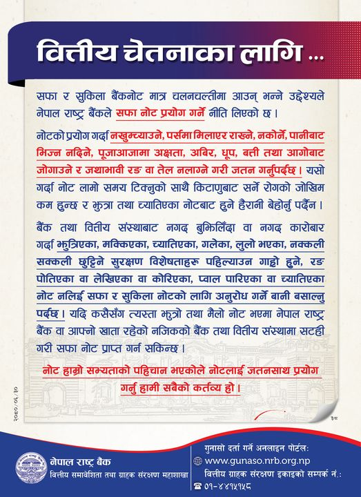 बैंक तथा वित्तीय संस्थाबाट नगद बुझिलिँदा वा नगद कारोबार गर्दा कुत्रिका, मक्किएका, च्यातिएका, गलेका, लुलो भएका, नक्कली सक्कली छुट्टिने सुरक्षण विशेषताहरु पहिल्याउन गाह्रो हुने, रङ पोतिएका वा लेखिएका वा कोरिएका, प्वाल पारिएका वा च्यातिएका नोट नलिई सफा र सुकिला नोटका लागि अनुरोध गर्ने बानी बसाल्न पनि राष्ट्र बैंकले आग्रह गरेको छ। ‘यदि कसैसँग त्यस्ता भुत्रो तथा मैलो नोट भएमा नेपाल राष्ट्र बैंक वा आफ्नो खाता रहेको नजिकको बैंक तथा वित्तीय संस्थामा सटही गरी सफा नोट प्राप्त गर्न सकिन्छ’, राष्ट्र बैंकले जारी गरेको सूचनामा उल्लेख छ ।