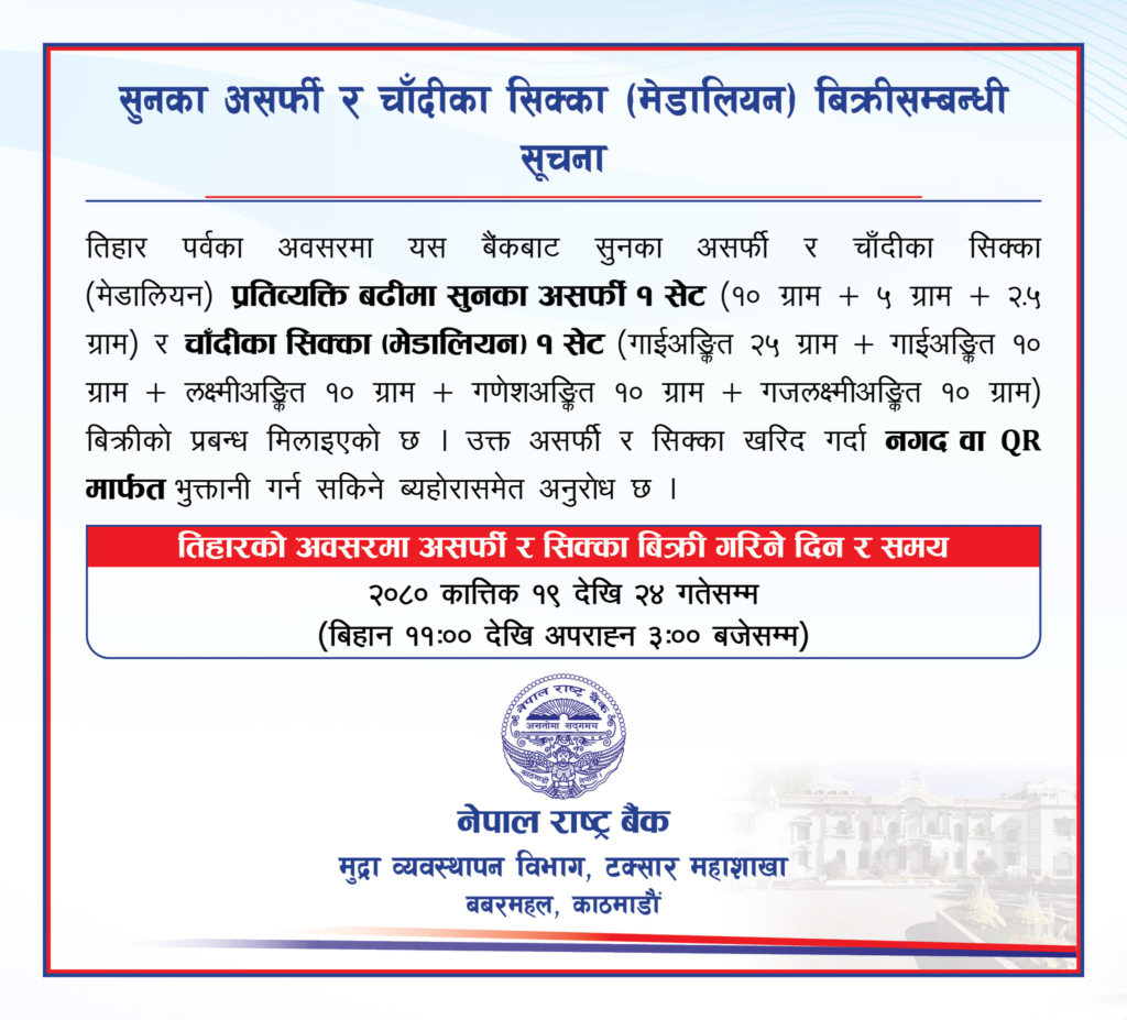 काठमाडौं । तिहारलाई लक्षित गरेर नेपाल राष्ट्र बैंकले यही कात्तिकको १९ गतेदेखि सुनका असर्फी र चाँदीका सिक्का बिक्री गर्ने भएको छ ।