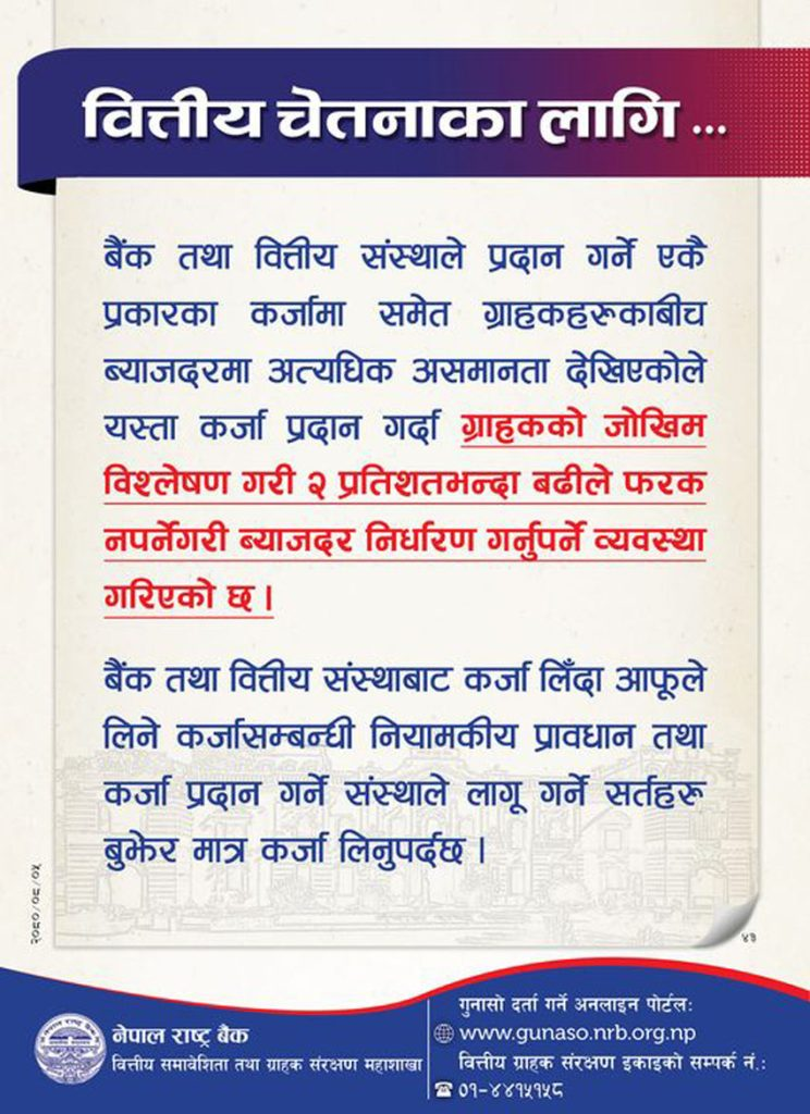 ‘बैंक तथा वित्तीय संस्थाले प्रदान गर्ने एकै प्रकारका कर्जामा समेत ग्राहकहरूका बीच ब्याजदरमा अत्यधिक असमानता देखिएकोले यस्ता कर्जा प्रदान गर्दा ग्राहकको जोखिम विश्लेषण गरी २ प्रतिशतभन्दा बढीले फरक नपर्नेगरी ब्याजदर निर्धारण गर्नुपर्ने व्यवस्था गरिएको छ’, राष्ट्र बैंकले जारी गरेको सुचनामा भनिएको छ ।