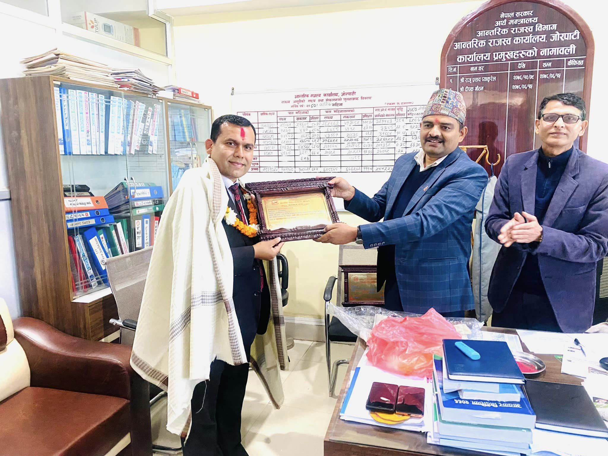 आन्तरिक राजस्व कार्यालय, जोरपाटीले आज एक कार्यक्रमको बीच संस्थाका प्रमुख कायकारी विकल्प पाठकलाई सम्मान पत्र हस्तान्तरण गरेको हो ।