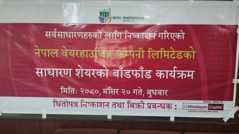 काठमाडौं । नेपाल वेयरहाउजिङ्ग कम्पनी लिमिटेडले निष्काशन गरेको आईपीओ आज बुधबार बाँडफाँड भएको छ । बिक्री प्रबन्धक हिमालयन क्यापिटलले बुधबार बिहान सेयर बाँडफाँड गरेको हो ।