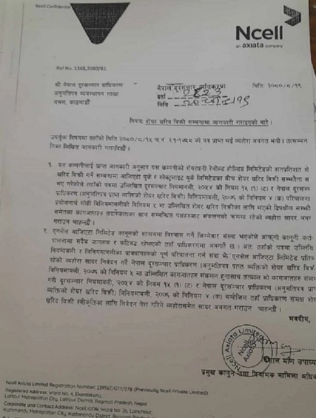 ‘दूरसञ्चार नियमावली, २०५४ को नियम १५ (ट) बमोजिम चुक्ता पुँजीको पाँच प्रतिशत भन्दा वढी शेयर खरिद वा विक्री गर्नु अघि प्राधिकरणको स्वीकृति लिनुपर्ने व्यवस्था उल्लेख भएको र नेपाल दूरसञ्चार प्राधिकरण (अनुमतिपत्र प्राप्त व्यक्तिको शेयर खरिद बिक्री) विनियमावली, २०७६ को विनियम ४ (क) बमोजिम अनुमतिपत्र प्राप्त व्यक्तीले आफ्ना शेयरधनीको शेयर खरिद बिक्री वा नामसारी गर्नुपूर्व प्राधिकरणको स्वीकृति प्राप्त गर्नु पर्ने व्यवस्था रहेकोले सो अनुरूप गर्न गराउन जानकारी गराइन्छ’, प्राधिकरणका उपनिर्देशक सुन्दर प्याकुरेले एनसेल आजियाटालाई पठाएको पत्रमा उल्लेख छ ।