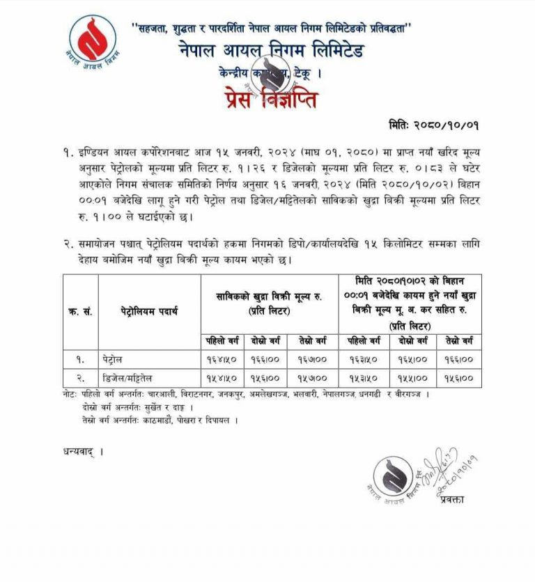 नयाँ मूल्य आजै रातिदेखि लागू हुनेछ । अब पेट्रोलको प्रतिलिटर पहिलो वर्गमा १६३.५०, दोस्रो वर्गमा १६५, र तेस्रो वर्गमा १६६ रुपैयाँ कायम भएको छ ।