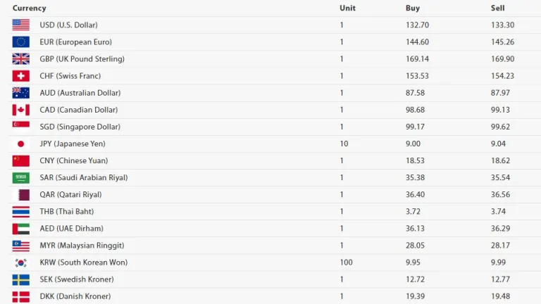 अमेरिकी डलर एकको खरिद दर १३२ रुपैयाँ ७० पैसा र बिक्री दर १३३ रुपैयाँ ३० पैसा पुगेको छ। युरो एकको खरिद दर १४४ रुपैयाँ ६० पैसा र बिक्री दर १४५ रुपैयाँ २६ पैसा रहेको छ।