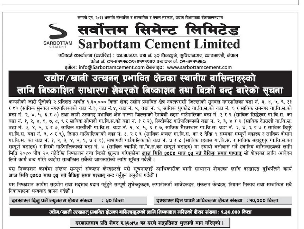 सर्वोत्तम सिमेन्टले पहिलो पल्ट बुक बिल्डिङ विधिबाट आईपीओ जारी गरेको हो । उक्त आईपीओ उद्योग प्रभावित क्षेत्रका स्थानीय बासिन्दाहरुका लागि खुला गरिएको थियो सोही आईपीओमा आवेदन दिने आज अन्तिम दिन रहेकोले आवेदकले आज कार्यालय समयभित्र आवेदन दिनसक्ने छन । स्थानीय बासिन्दाका लागि ९ लाख ३० हजार कित्ता बिक्रीमा ल्याएको हो ।