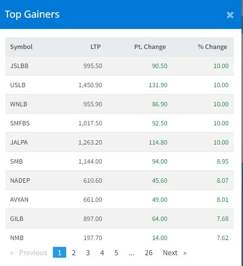 आज सबैभन्दा धेरै पाँच कम्पनीका लगानीकर्ताले कमाएका छन् । आज यी ५ कम्पनीका लगानीकर्ताले १० प्रतिशतका दरले कमाएका हुन् । जनउत्थान सामुदायिक लघुवित्त, उन्नती सहकार्य लघुवित्त, विन नेपाल लघुवित्त, स्वाभिमान लघुवित्त र जाल्पा लघुवित्त वित्तीय संस्थाका लगानीकर्ताले १० प्रतिशतका दरले कमाएका छन् ।