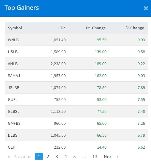 आज सबैभनदा धेरै विन नेपाल लघुवित्तका लगानीकर्ताले कमाएका छन् । आज यस कम्पनीका लगानीकर्ताले ९ दशमलव ९९ प्रतिशतका दरले कमाएका छन् । आज उन्नती सहकार्य लघुवित्तका लगानीकर्ताले ९ दशमलव ५८ प्रशिततका दरले कमाएका छन् । आत्मानिर्भर लघुवित्तका लगानकिर्ताले ९ दश्मलव २२ प्रतिशतका दरले कमाएका छन् ।