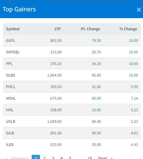 आज पाँच कम्पनीको शेयर मूल्यमा सकारात्मक सर्किट लागेको छ । गोर्खाज फाइनान्स, सप्तकोशी डेभलपमेन्ट बैंक, पिपुल्स पावर, धौलागिरी लघुवित्त वित्तीय संस्थाका लगानीकर्ताले १० प्रतिशतका दरले कमाएका छन् । पिपुल्स हाइड्रोपावर कम्पनीका लगानीकर्ताले ९ दशलमव ९९ प्रतिशतका दरले कमाएका छन् ।
