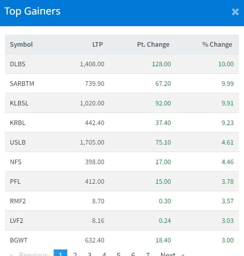 आज सबैभन्दा धेरै धौलागिरी लघुवित्त वित्तीय संस्थाका लगानीकर्ताले कमाएका छन् । आज यस कम्पनीका लगानीकर्ताले १० प्रतिशतका दररले कमाएका हुन् । सर्वोत्तम सिमेन्टका लगानीकर्ताले ९ दशमलव ९९ प्रतिशतका दरले कमाएका हुन् । किसन घलुवित्तका लगानीकर्तादे ९ दशलमव ९१ प्रतिशतका दरले कमाएका हुन् ।