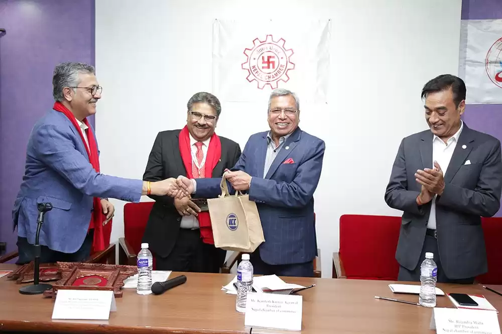 नेपाल चेम्बर अफ कमर्सको निमन्त्रणमा इण्डियन चेम्बर र मिलेनियल चेम्बर अफ कमर्सका पदाधिकारीहरु एवं व्यवसायिक प्रतिनिधीमण्डल नेपाल आएका हुन । दुवै चेम्बरका पदाधिकारीलाई नेपाल चेम्बर अफ कमर्सका अध्यक्ष कमलेश अग्रवालले जमलस्थित चेम्बर भवनमा स्वागत गरेका थिए ।