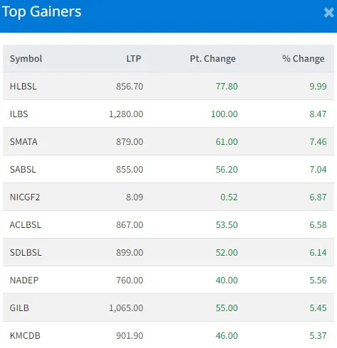 आज हिमालयन लघुवित्त वित्तीय संस्थाका शेयरधनीहरुले सबैभन्दा बढी ९.९९ प्रतिशतले नाफा कमाएका छन् ।त्यस्तै बोटलर्स नेपाल तराई लिमिटेडका लगानीकर्ताहरुले सबैभन्दा बढी ६.२३ प्रतिशतले घाटा व्यहोरेका छन् ।