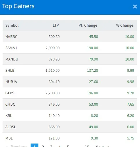 आज सबैभन्दा धेरै नारायणी डेभलपमेन्ट बैंक, समाज लघुवित्त वित्तीय संस्था र माण्डु हाइड्रोपावर कम्पनीका लगानीकर्ताले कमाएका छन् । आज यस ३ कम्पनीका लगानीकर्ताले १० प्रतिशतका दरले कमाएको छन् । सृजनशिल लघुवित्त वित्तीय संस्थाका लगानीकर्ताले ९ दशमलव ९९ प्रतिशतका दरले कमाएका छन् ।