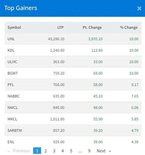 आज सबैभन्दा धेरै युनिलिभर नेपाल, कालिञ्चोक दर्शन, अपर लोहरे खोला र भगवती हाइड्रोपावर कम्पनीका लगानीकर्ताले कमाएका छन् । आज यी चार कम्पनीका लगानीकर्ताले १० प्रतिशतका दरले कमाएका छन् ।आज सबैभन्दा धेरै बुद्ध भुमि नेपालका लगानीकर्ताले गुमाएका छन् । आज यस कम्पनीका लगानीकर्ताले ९ दशलमव ४१ प्रतिशतका दरले गुमाएका छन् ।