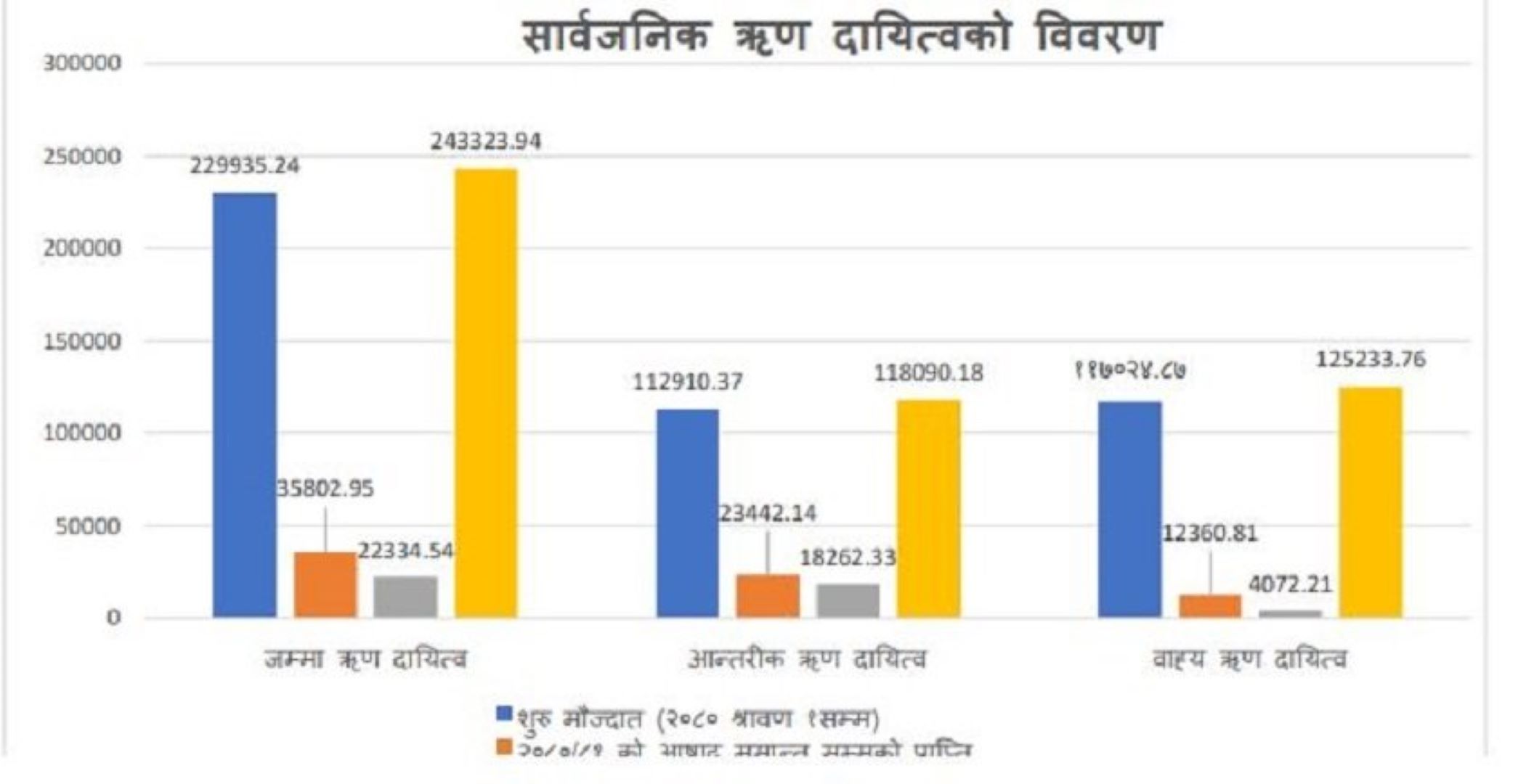 २०८० असार मसान्तसम्म नेपालको सार्वजनिक ऋण २२ खर्ब ९९ अर्ब रहेको थियो । समीक्षा अवधिमा कायम कूल ऋणमध्ये ४८.५३ प्रतिशत अर्थात् ११ खर्ब ८० अर्ब ९० करोड १८ लाख रुपैयाँ आन्तरिक ऋण रहेको छ भने ५१.४७ प्रतिशत अर्थात् १२ खर्ब ५३ अर्ब १३ करोड ४७ लाख रुपैयाँ बाह्य ऋण रहेको छ ।