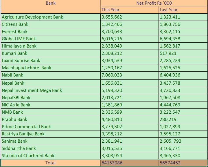 बैंकहरूले सार्वजनिक गरेको गत आवको चौथो त्रैमाससम्मको वित्तीय विवरणअनुसार सो नाफा कमाएको देखिएको हो । यसरी हेर्दा बैंकहरुको यो नाफा अघिल्लो आव २०७९ ८० को सोह िअवधिको तुलनामा १३.४० प्रतिशतले बढी हो । अघिल्लो आवमा बैंकहरुले ५६ अर्ब ५७ करोड ४४ लाख रुपियाँ खुद नाफा कमाएका थिए ।