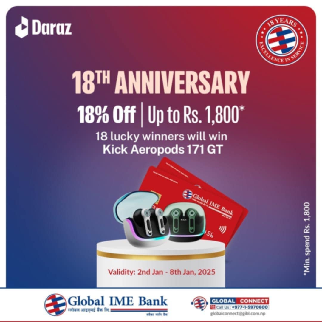 पौष १८ गते विहीबारदेखि ग्लोबल आइएमई बैंकले आफ्नो स्थापनाको १८औं वर्ष पुरा गर्दैछ ।यो छुट योजना पौष १८ गते विहिबारदेखि पौष २४ गते बुधबारसम्म रहनेछ ।