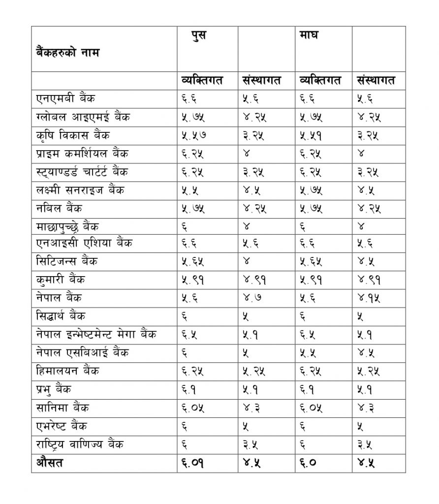 दुई बैंकले ब्याजदर घटाएका छन् भने एउटा बैंकले ब्याजदर बढाएको छ । कृषि विकास बैंक र नेपाल एसबीआई बैंकले ब्याजदर घटाएका छन् । कृषि विकास बैंकले माघ महिनाका लागि व्यक्तिगत खातामा ५.५१ प्रतिशत र संस्थागत खातामा ३.२५ प्रतिशत ब्याजदर तोकेको छ । यो अघिल्लो महिनाको तुलनामा व्यक्तिगत खातामा ५.५७ बाट घटेको हो भने संस्थागत खातामा ३.२५ मै कायम रहेको छ ।