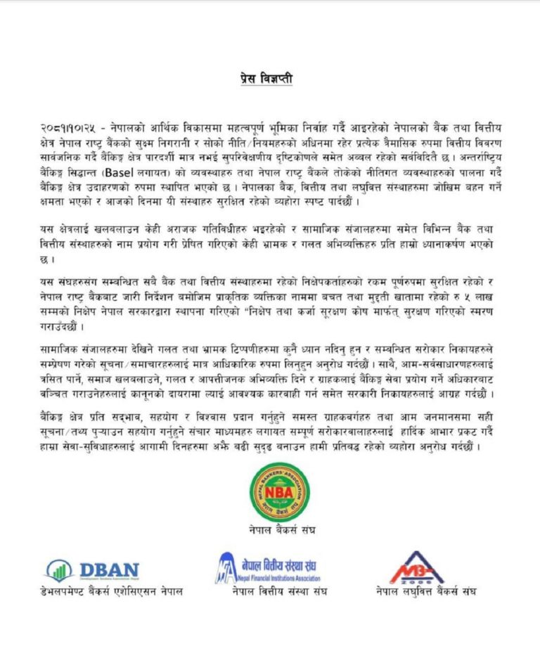 साथै, आम–सर्वसाधारणहरूलाई त्रसित पार्ने, समाज खलबलाउने, गलत र आपत्तिजनक अभिव्यक्ति दिने र ग्राहकलाई बैंकिङ्ग सेवा प्रयोग गर्ने अधिकारबाट वञ्चित गराउनेहरूलाई कानुनको दायरामा ल्याई आवश्यक कारबाही गर्न समेत सरकारी निकायहरूलाई संघले आग्रह गरेको छ ।