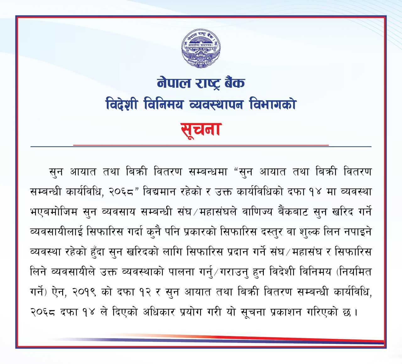 बैंकले शुल्क नलाग्ने व्यवस्थालाई पूर्ण कार्यान्वयन गर्दै सिफारिस लिन आउने आयातकर्ता वा व्यवसायीलाई निःशुल्क सेवा दिन समेत निर्देशन दिएको छ । सुन आयात तथा बिक्री वितरण सम्बन्धमा ‘सुन आयात तथा बिक्री वितरण सम्बन्धी कार्यविधि, २०६८’ रहेको छ। उक्त कार्यविधिको दफा १४ मा व्यवस्था भएबमोजिम सुन व्यवसाय सम्बन्धी संघ, महासंघले वाणिज्य बैंकबाट सुन खरिद गर्ने व्यवसायीलाई सिफारिस गर्दा कुनै पनि प्रकारको सिफारिस दस्तुर वा शुल्क लिन नपाइने व्यवस्था रहेको छ ।
