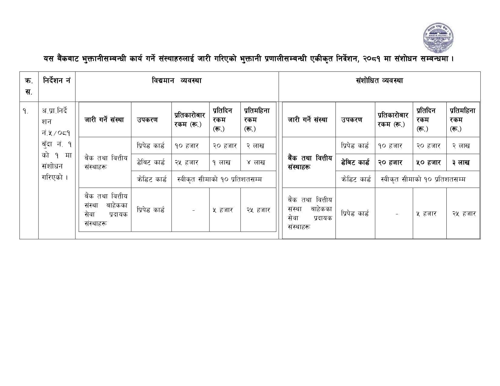 केन्द्रीय बैंकले बैंक वित्तीय संस्थाले जारी गर्ने प्रिपेड कार्डको प्रति कारोबार १० हजार, प्रतिदिन २० हजार र प्रति महिना २ लाखको सीमा यथावत राखेको छ ।