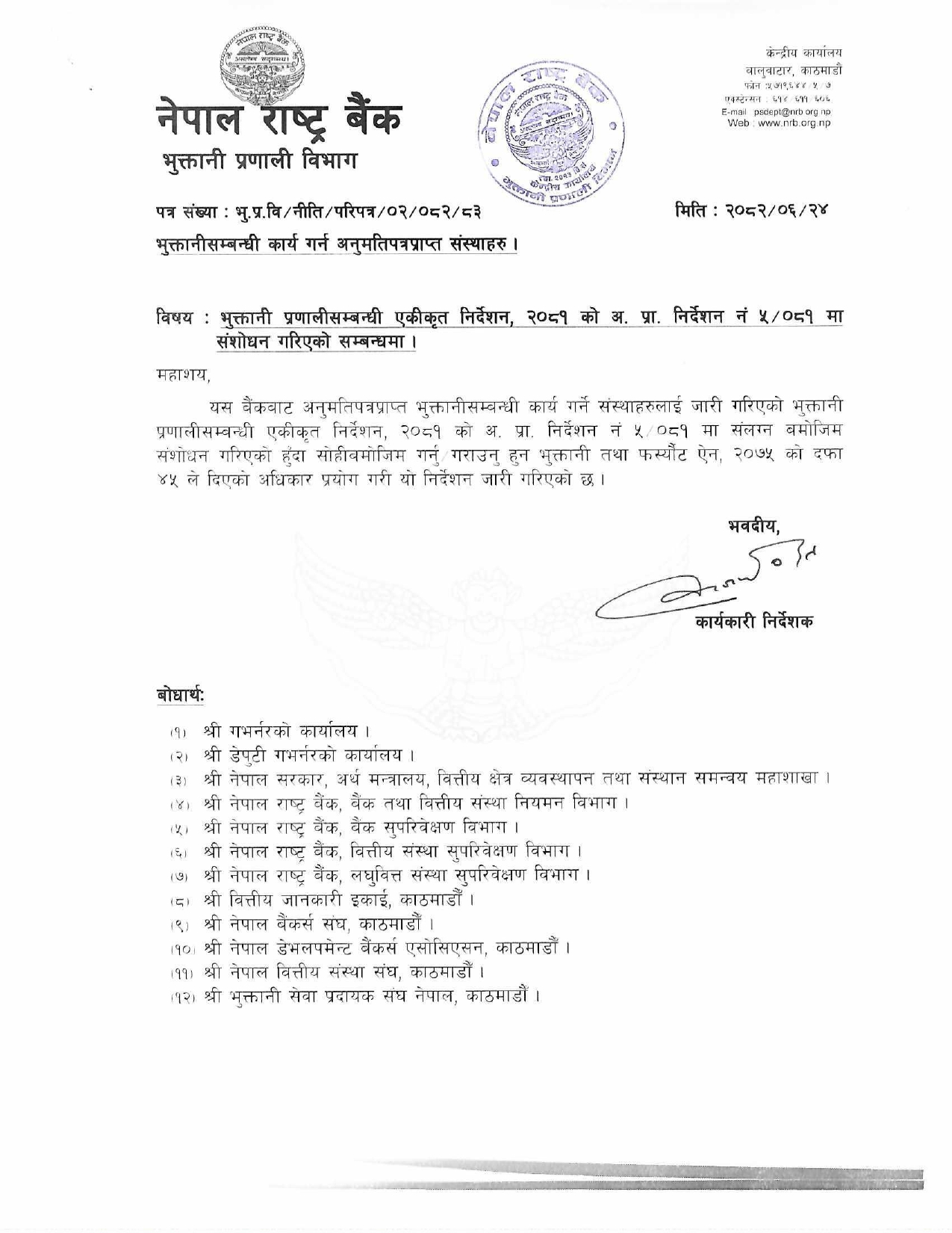 त्यसैगरी क्रेडिट कार्डको सीमा पनि परिवर्तन नभएको बैंकले जनाएको छ । बैंक तथा वित्तीय संस्था बाहेकका सेवा प्रदायक संस्थाले जारी गर्ने प्रिपेड कार्डको प्रति दिन ५ हजार र प्रति महिना २५ हजार रुपैयाँको सीमा समेत यथावत राखेको केन्द्रीय बैंकले जनाएको छ ।