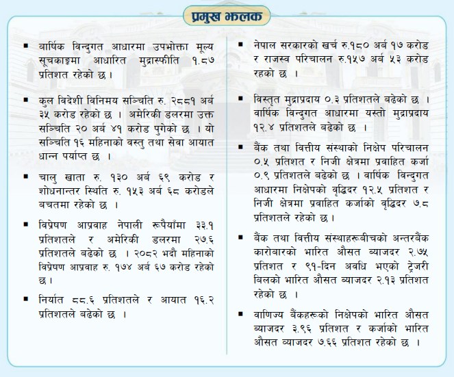त्यसैगरी आर्थिक वर्ष २०८२-८३ को दोस्रो महिनाको आयातलाई आधार मान्दा बैंकिङ क्षेत्रसँग रहेको विदेशी विनिमय सञ्चिति १९.७ महिनाको वस्तु आयात र १६ महिनाको वस्तु तथा सेवा आयात धान्न पर्याप्त रहने देखिन्छ । २०८२ भदौ मसान्तमा विदेशी विनिमय सञ्चितिको कुल गार्हस्थ्य उत्पादन, कुल आयात र विस्तृत मुद्राप्रदायसँगका अनुपातहरू क्रमशः ४७.२ प्रतिशत, १३३.१ प्रतिशत र ३६.६ प्रतिशत रहेका छन् । २०८२ असार मसान्तमा उक्त अनुपातहरू क्रमशः ४३.८ प्रतिशत, १२८.१ प्रतिशत र ३४.१ प्रतिशत रहेका थिए ।