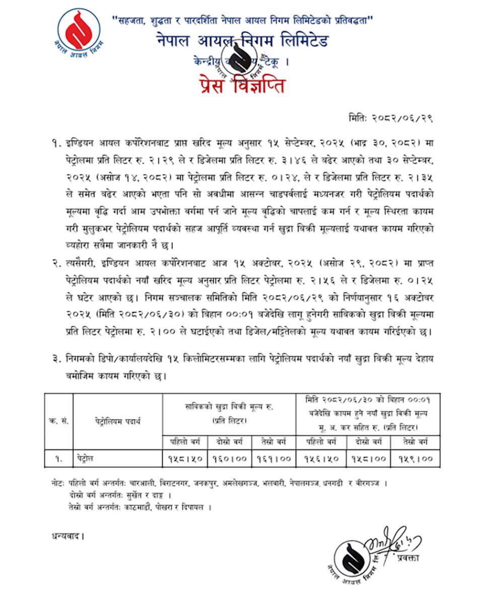 भारतबाट पेट्रोलमा २.५६ रुपैयाँले र डिजेलमा २५ पैसाले घटेर आएकोले निगमले बुधबार राति १२ बजेपछि लागू हुनेगरी पेट्रोलमा प्रतिलिटर २ रुपैयाँले घटाएको छ । मुल्य परिवर्तनपछि काठमाडौँमा पेट्रोल प्रति लिटर १५९ भएको निगमले जनाएको छ ।