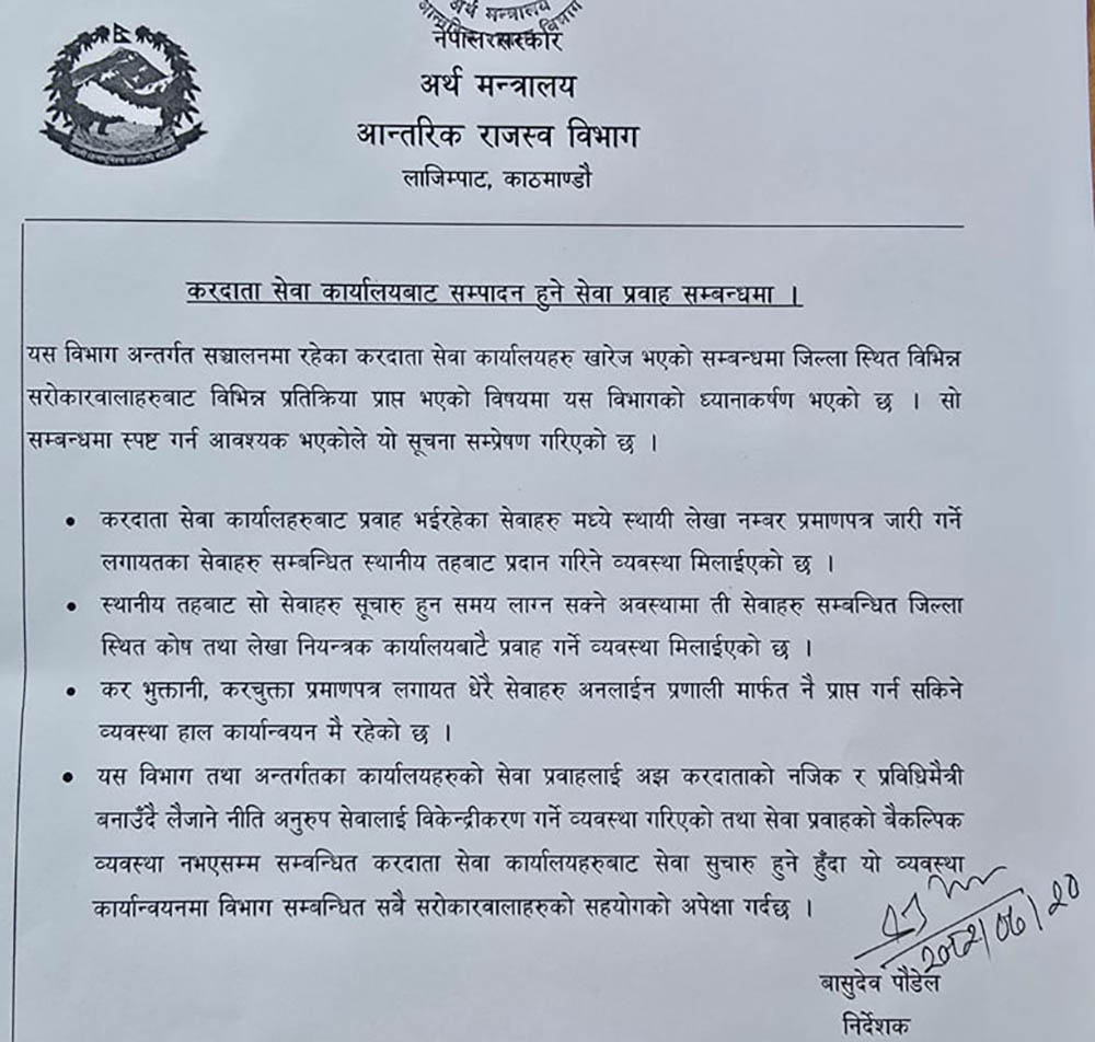विभागले करदाता सेवा कार्यालयहरू खारेजपछि लिने सेवा बारे जानकारी गराएको छ । विभागले स्थायी लेखा नम्बर (प्यान) प्रमाणपत्र जारी गर्नेलगायतका सेवा अब सम्बन्धित स्थानीय तहबाट उपलब्ध हुने जानकारी दिएको छ ।