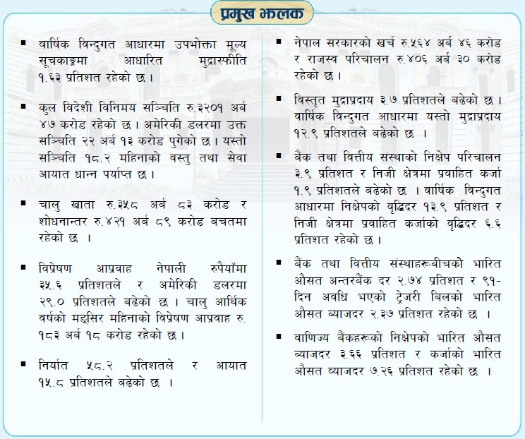 राष्ट्र बैंकका अनुसार २०८२ मङ्सिर महिनामा विप्रेषण आप्रवाह १८३ अर्ब १८ करोड रहेको छ भने अघिल्लो वर्षको सोही महिनामा विप्रेषण आप्रवाह ११८ अर्ब ७९ करोड रहेको थियो । त्यस्तै समीक्षा अवधिमा अमेरिकी डलरमा विप्रेषण आप्रवाह २९.० प्रतिशतले वृद्धि भई ६ अर्ब १६ करोड पुगेको छ । अघिल्लो वर्ष यस्तो आप्रवाह ३.४ प्रतिशतले बढेको थियो ।