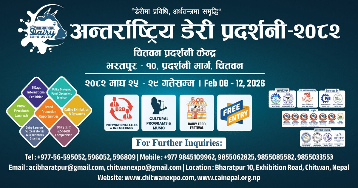यस प्रदर्शनीमा नेपाल र भारत गरी १२० दुग्ध उत्पादक र प्रविधि कम्पनी सहभागी हुने आज यहाँ पत्रकार सम्मेलनको आयोजना गरी जानकारी दिइयो । चितवन उद्योग संघको प्रदर्शनी केन्द्रमा हुन लागेको प्रदर्शनीमा डेरी उत्पादन, प्रक्रिया र वितरणमा नविनतम प्रविधि र अभ्यासलाई प्रोत्साहित गर्दै साना किसान, उद्योगी र व्यापारीलाई व्यावसायिक सञ्जामा जोड्न टेवा पुग्ने अध्यक्ष बगालेले बताए ।