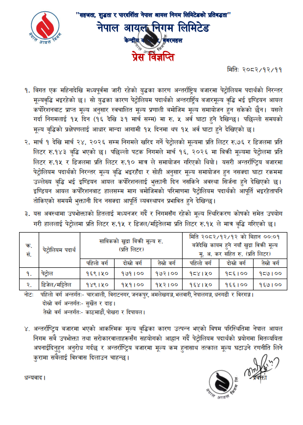 काठमाडौँ । नेपाल आयल निगमले पेट्रोलियम पदार्थको खुद्रा मूल्य पुनः समायोजन गर्दै वृद्धि गरेको छ। नयाँ दर बुधबार राति १२ बजेदेखि लागू हुने गरी निर्धारण गरिएको निगमले जनाएको छ।