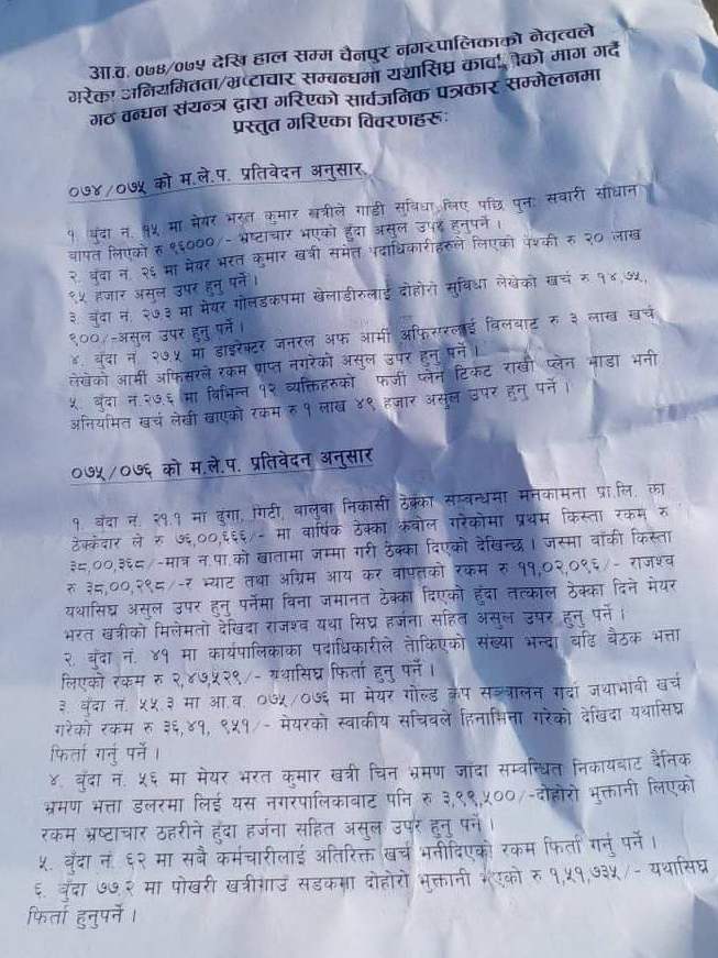 चार आर्थिक वर्षको महालेखा परिक्षकको प्रतिवेदनमा आधारित भएर नेपाली कांग्रेसका जिल्ला सचिव कुमारबाबु अधिकारीले गठनन्धका संयन्त्रका तर्फबाट चैनपुर नगरको अनियमितता भ्रस्टाचारको फेहरिस्ता प्रस्तुत गरेका थिए ।